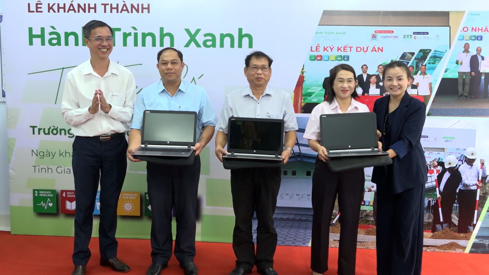 Trước đó, lúc 14h, tại Trường PTDT bán trú THCS Vĩnh Sơn, không khí cũng rộn ràng khi các đại biểu cắt băng khánh thành nhiều hạng mục ý nghĩa. Nhà trường đã được bàn giao khu vệ sinh hợp chuẩn, hệ thống điện mặt trời chiếu sáng, phòng tắm cho học sinh nữ và đặc biệt là phòng máy vi tính với 25 chiếc Chromebooks. Những công trình này mở ra cánh cửa mới, nơi tri thức số và giá trị xanh hòa quyện, thắp sáng niềm tin nơi vùng cao.